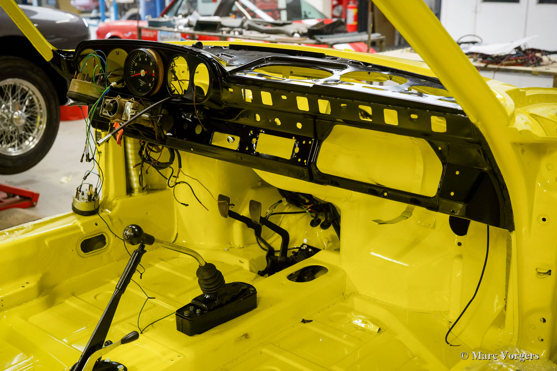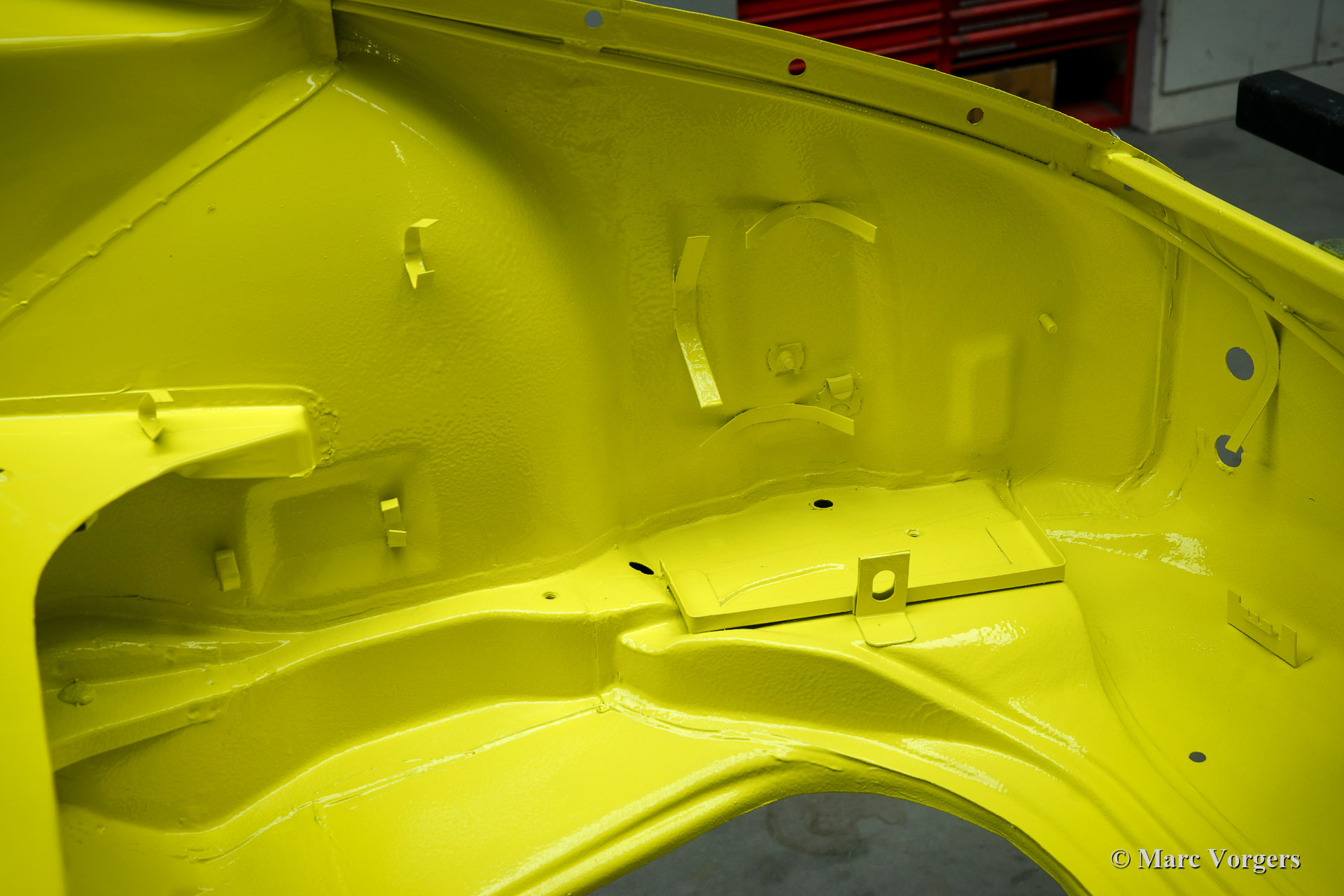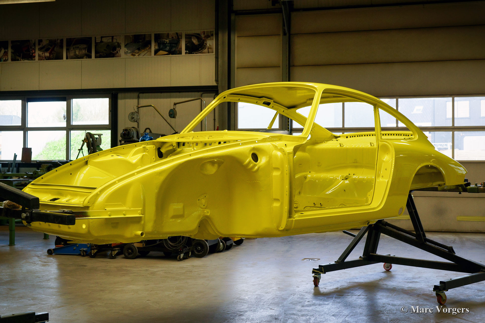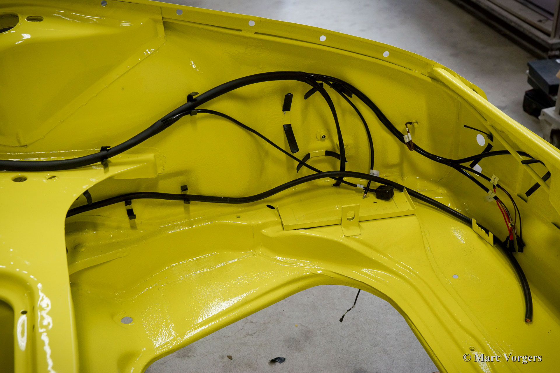 Nach Abschluss der Blecharbeiten erhielt der Körper in einem „Tauchbad“ eine schwarze KTL-Beschichtung (Primer). Auf diese Weise bedeckt die Beschichtung das Blech innen und außen, auch in den Nähten und in den kleinsten Hohlräumen. Danach wurde der Körper geglättet, grundiert und mit einer perfekten Lackierung in Zitronengelb versehen. Danach wurde das Auto mit den gereinigten und aufgearbeiteten Originalteilen, die vor der Restaurierung vorhanden waren, wieder aufgebaut. Verschleißteile und Gummis wurden natürlich während der Bauphase ausgetauscht. Hier haben Sie eine hervorragende Gelegenheit, eine SWB-Karosserie der Porsche 911 F-Serie im Detail zu studieren!