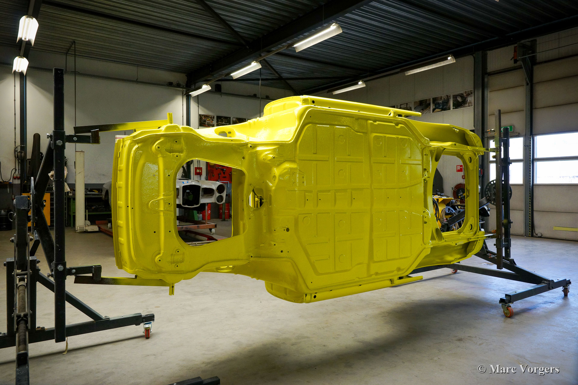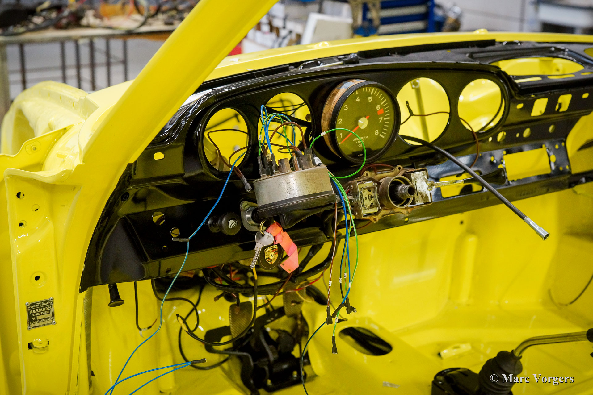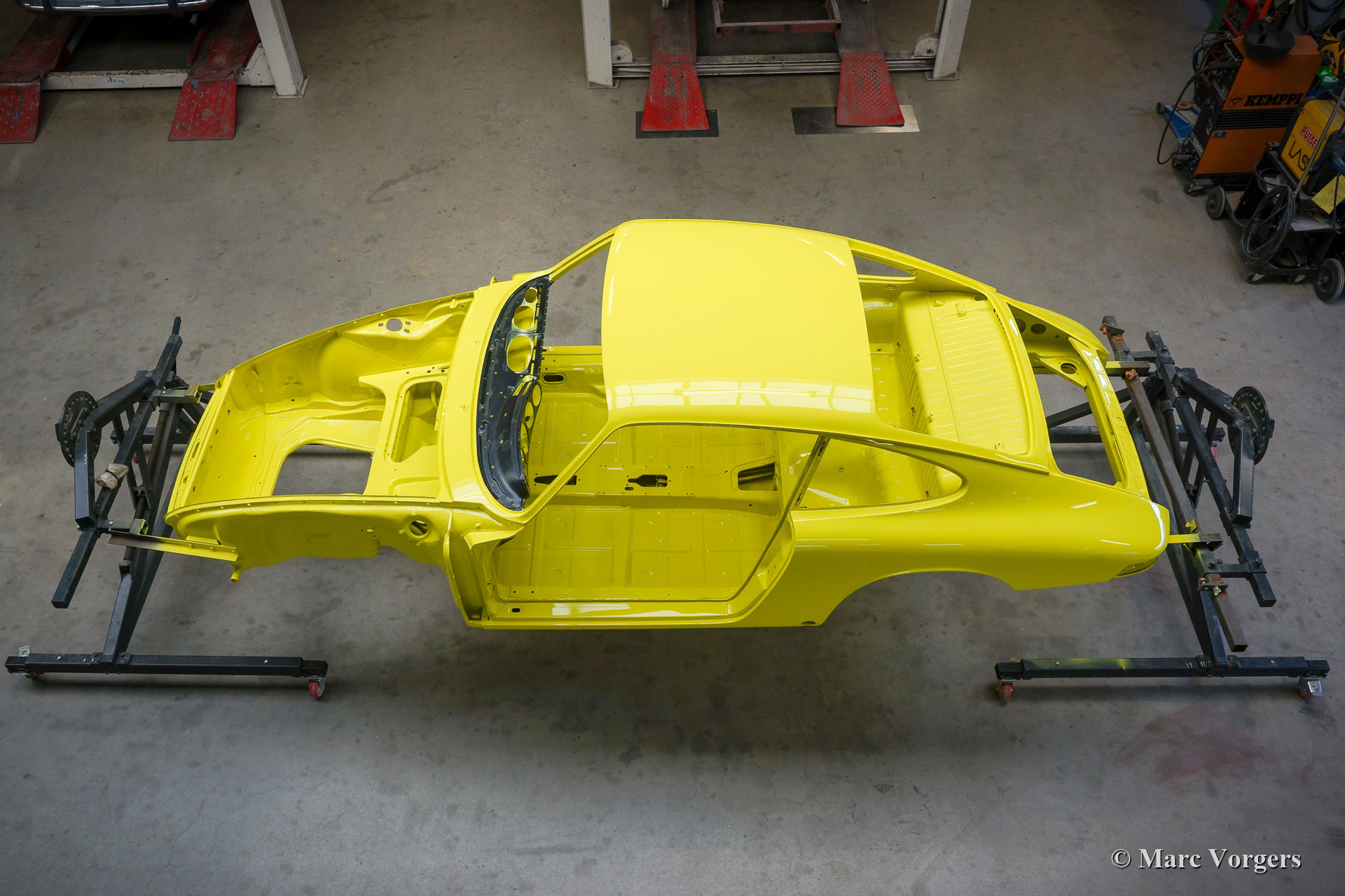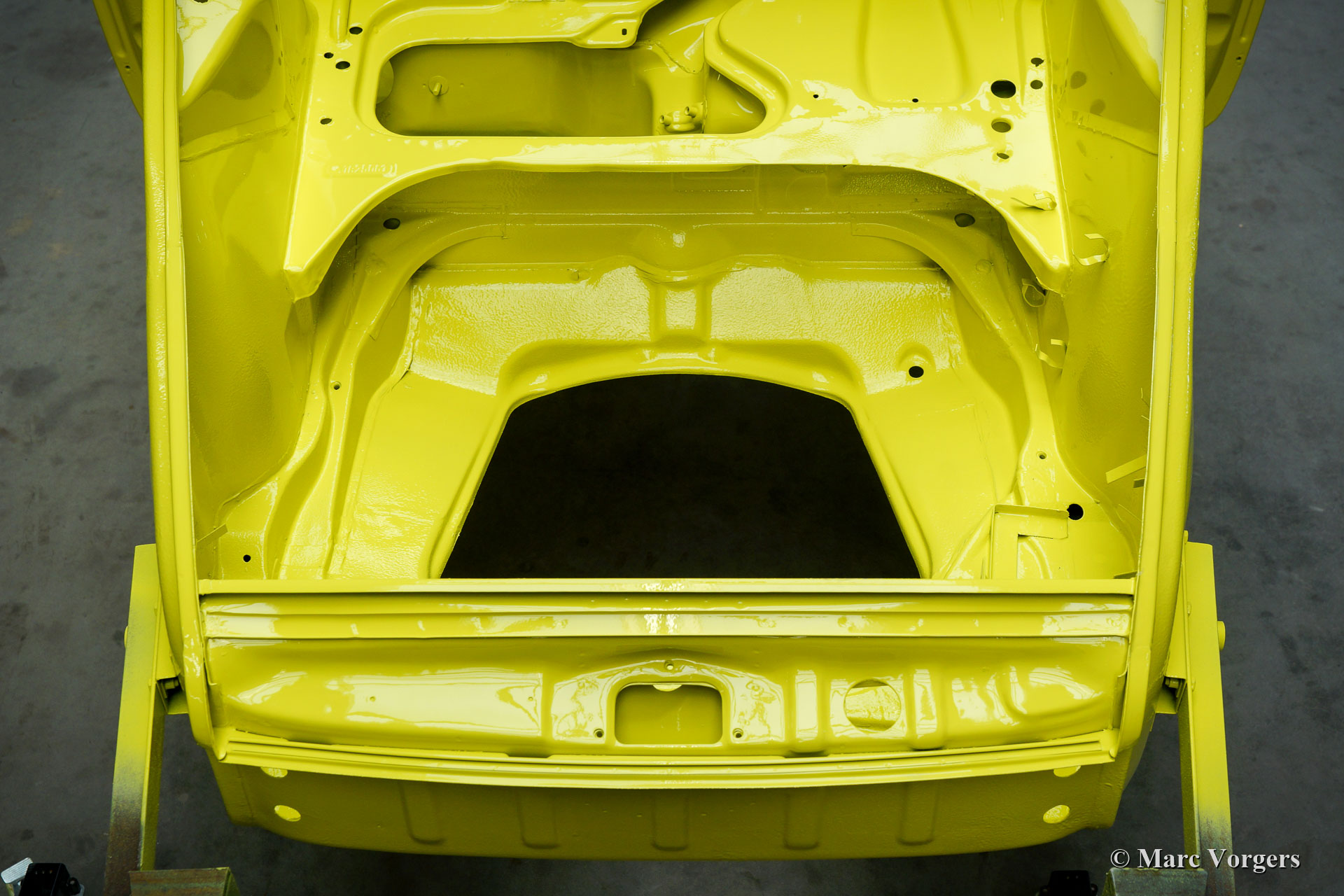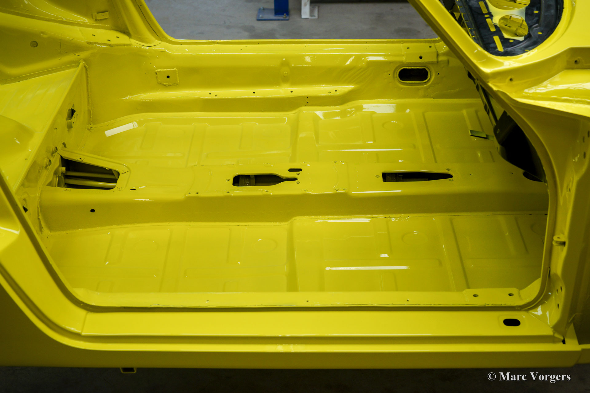Nach Abschluss der Blecharbeiten erhielt der Körper in einem „Tauchbad“ eine schwarze KTL-Beschichtung (Primer). Auf diese Weise bedeckt die Beschichtung das Blech innen und außen, auch in den Nähten und in den kleinsten Hohlräumen. Danach wurde der Körper geglättet, grundiert und mit einer perfekten Lackierung in Zitronengelb versehen. Danach wurde das Auto mit den gereinigten und aufgearbeiteten Originalteilen, die vor der Restaurierung vorhanden waren, wieder aufgebaut. Verschleißteile und Gummis wurden natürlich während der Bauphase ausgetauscht. Hier haben Sie eine hervorragende Gelegenheit, eine SWB-Karosserie der Porsche 911 F-Serie im Detail zu studieren!