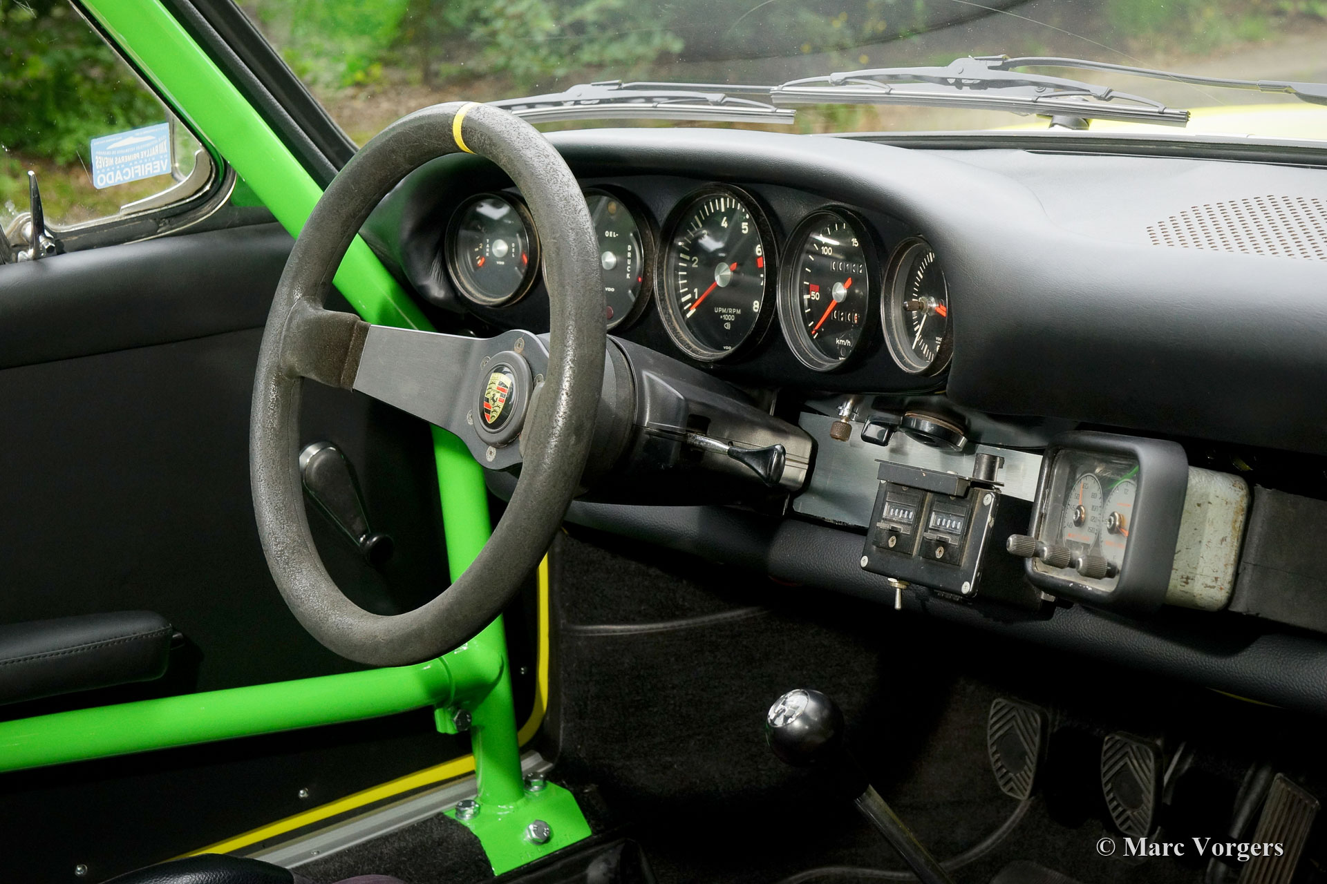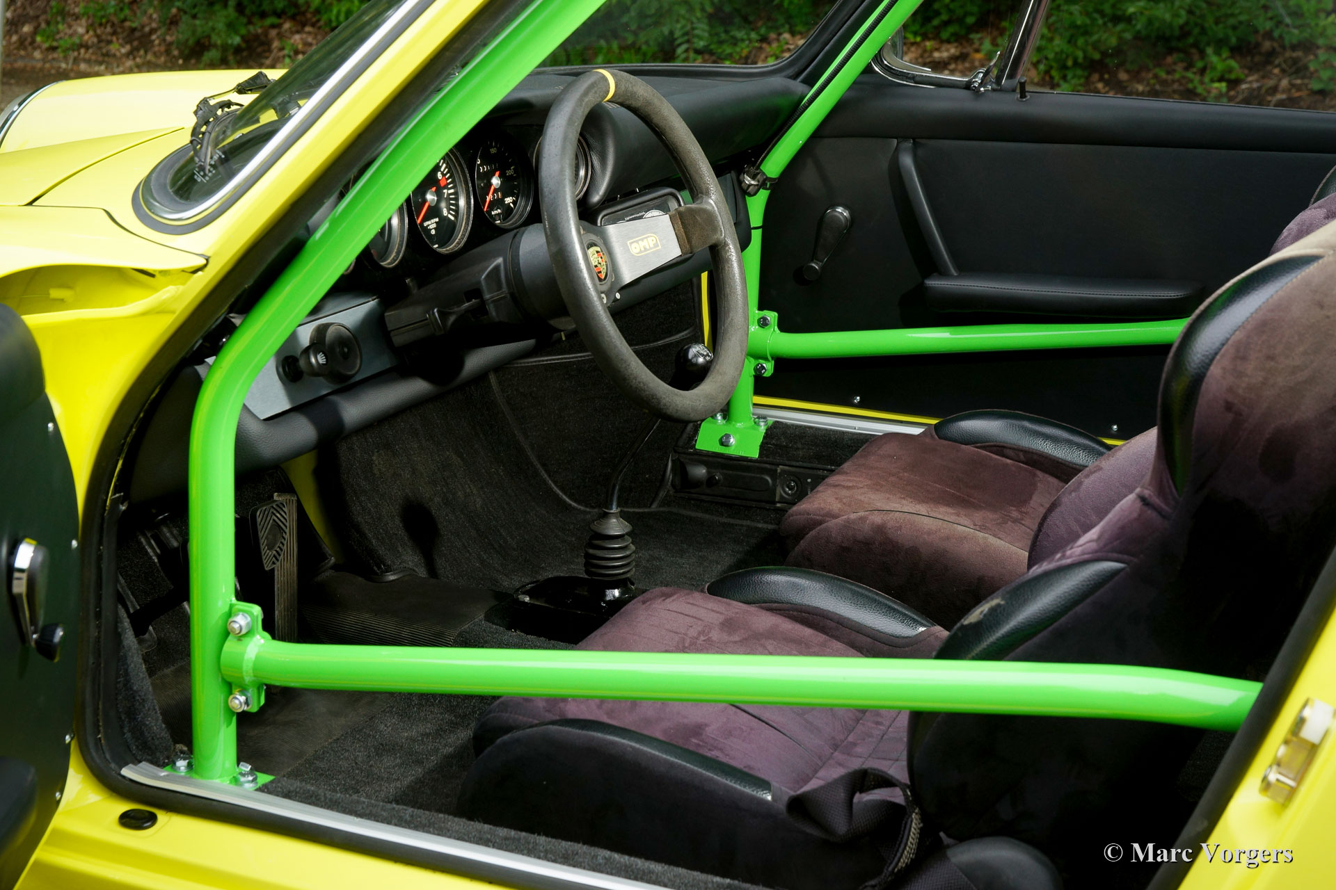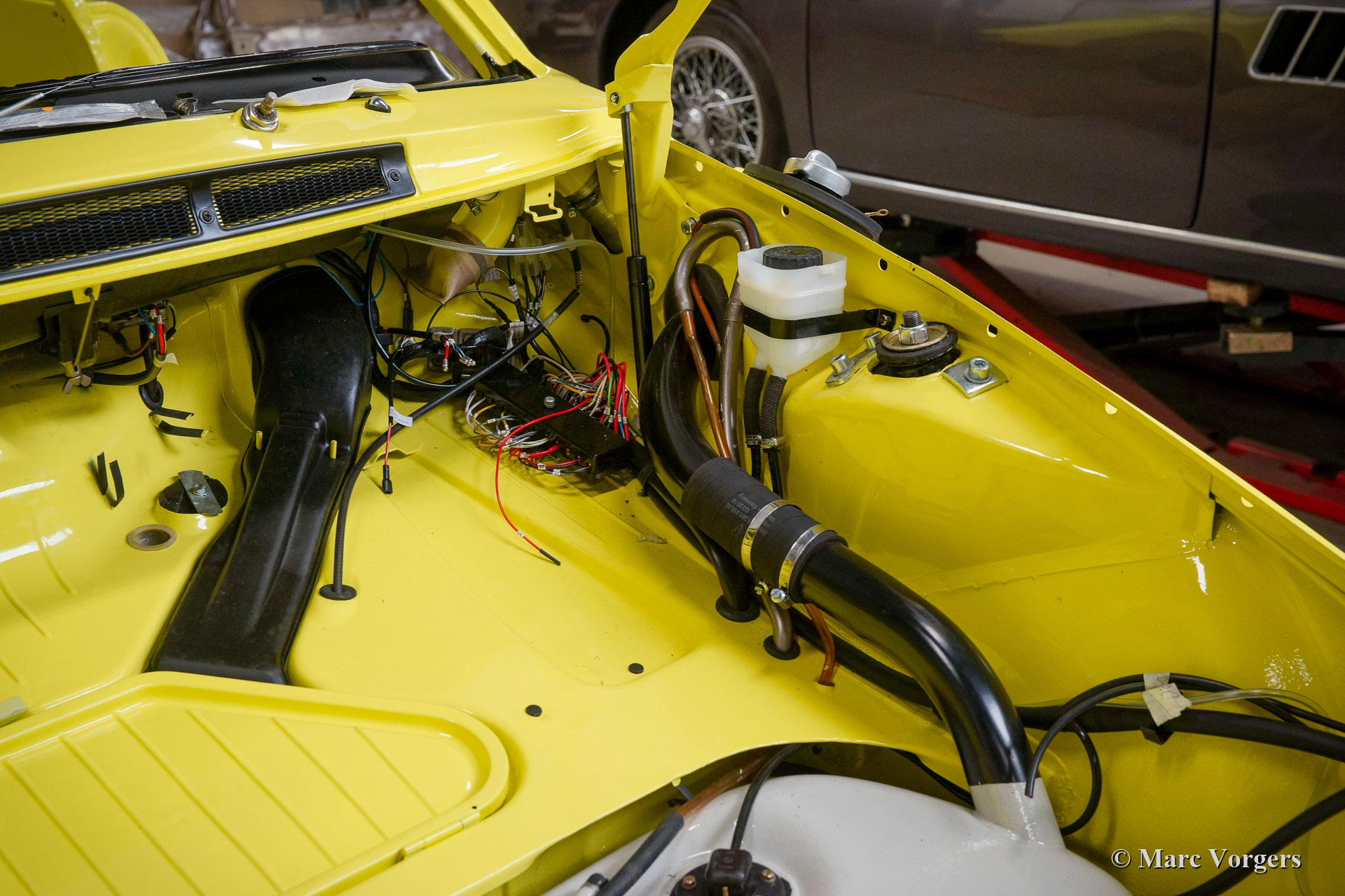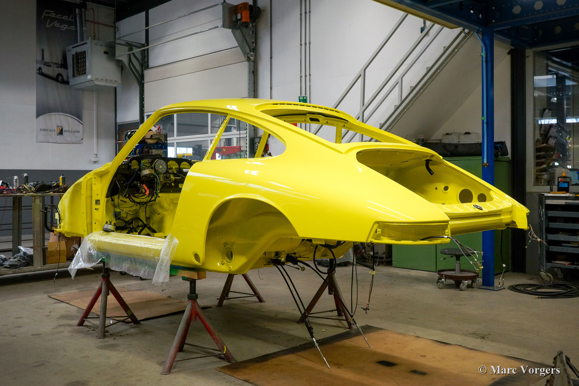 Nach Abschluss der Blecharbeiten erhielt der Körper in einem „Tauchbad“ eine schwarze KTL-Beschichtung (Primer). Auf diese Weise bedeckt die Beschichtung das Blech innen und außen, auch in den Nähten und in den kleinsten Hohlräumen. Danach wurde der Körper geglättet, grundiert und mit einer perfekten Lackierung in Zitronengelb versehen. Danach wurde das Auto mit den gereinigten und aufgearbeiteten Originalteilen, die vor der Restaurierung vorhanden waren, wieder aufgebaut. Verschleißteile und Gummis wurden natürlich während der Bauphase ausgetauscht. Hier haben Sie eine hervorragende Gelegenheit, eine SWB-Karosserie der Porsche 911 F-Serie im Detail zu studieren!