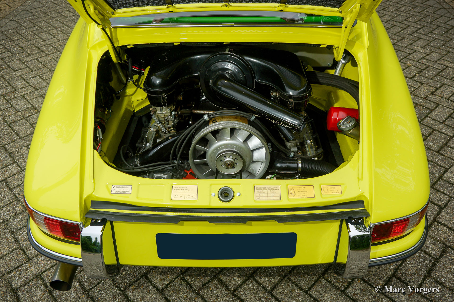 The Porsche 911 was designed with a steel unitary bodywork construction in which the engine was located behind the rear axle. The 911 engine is a air-cooled six cylinder "boxer" engine. The suspension of the Porsche 911 was independent from the start as was a five speed gearbox with floor shift.