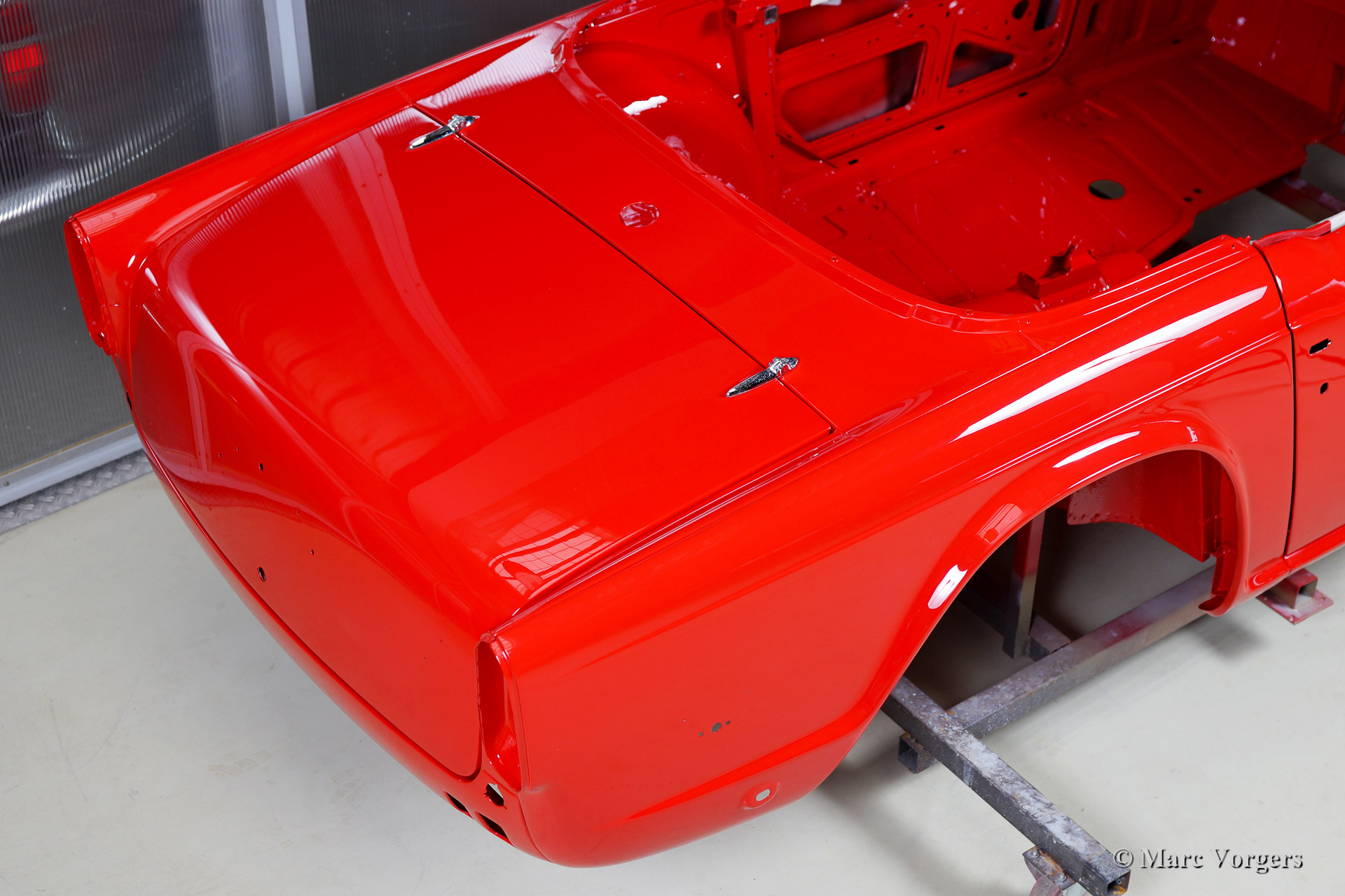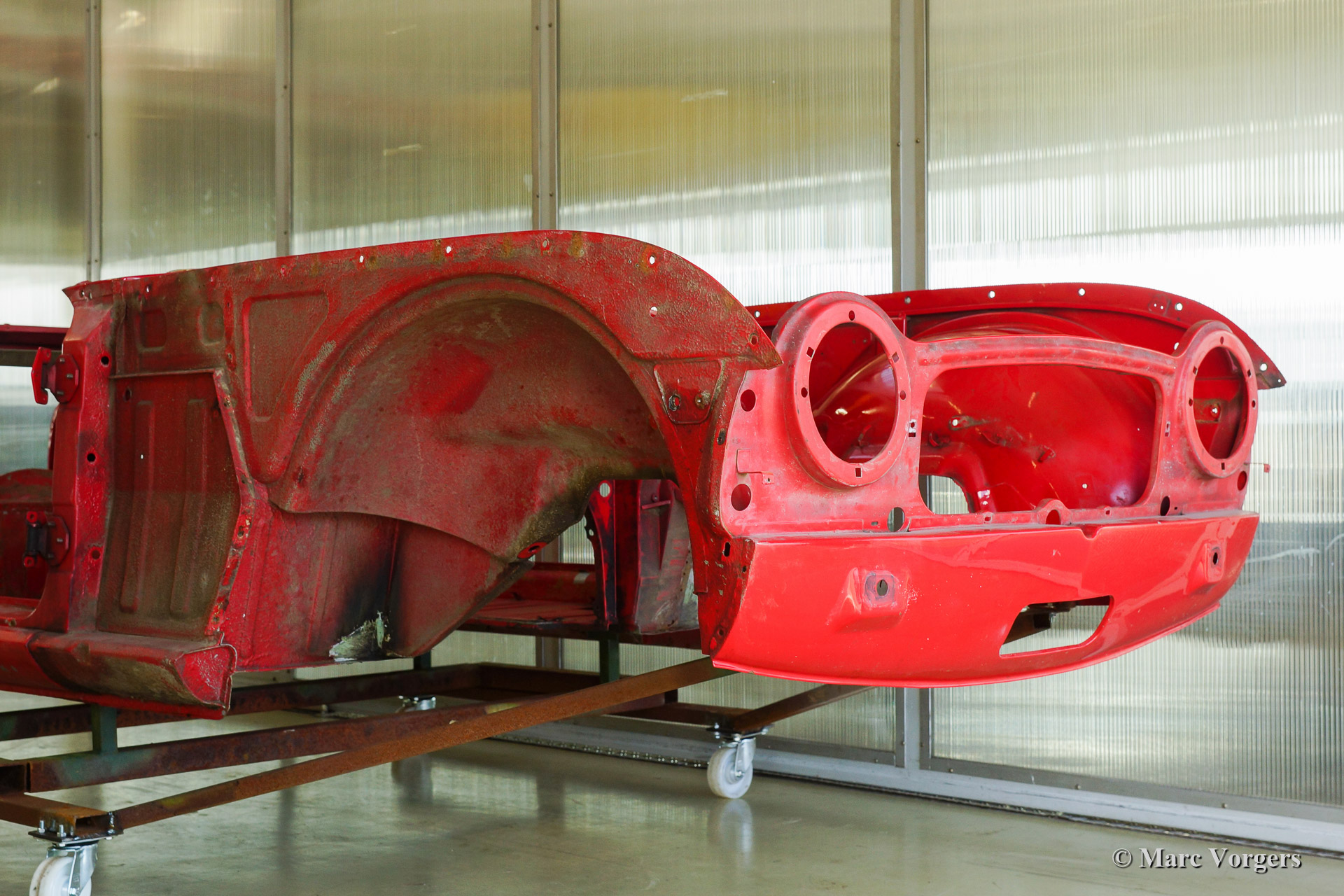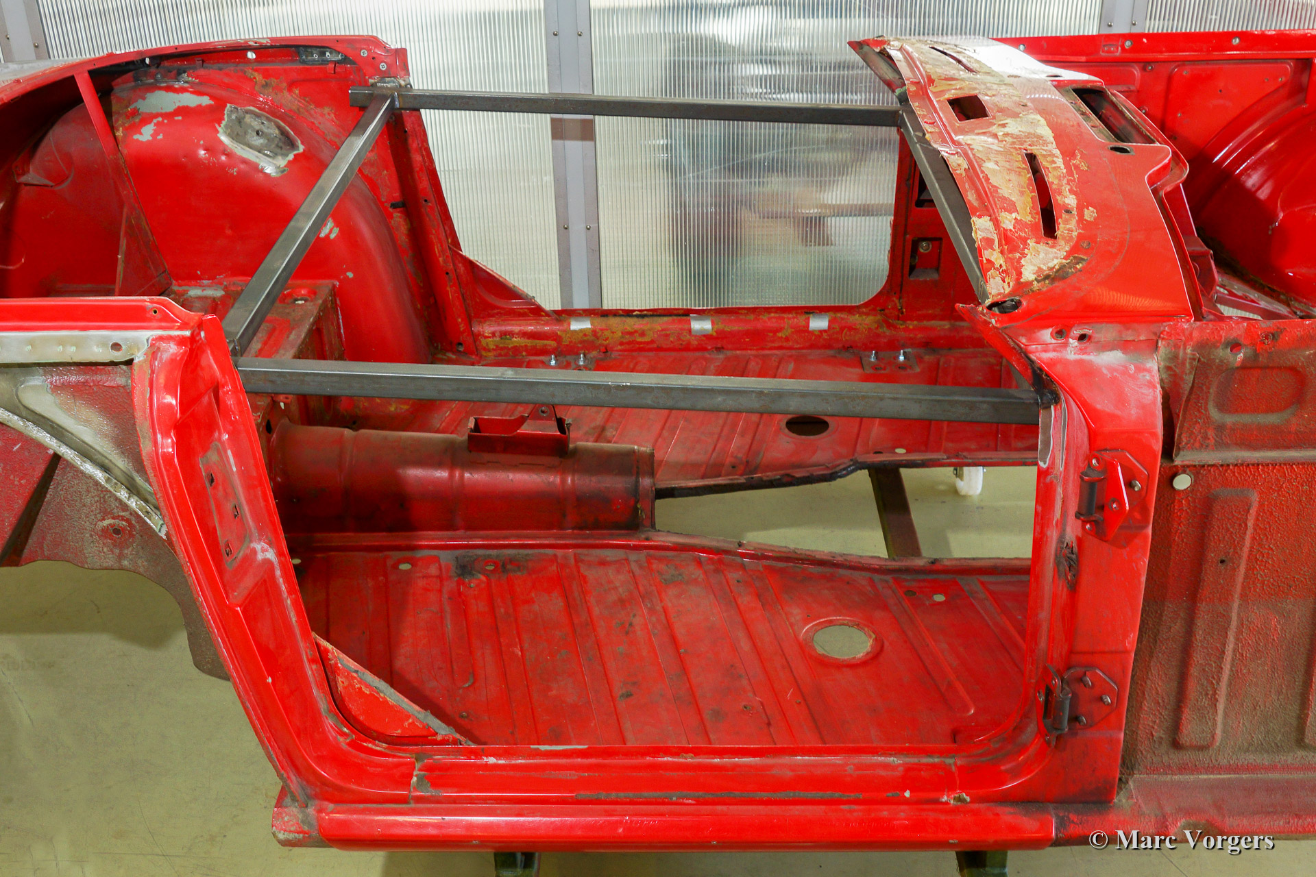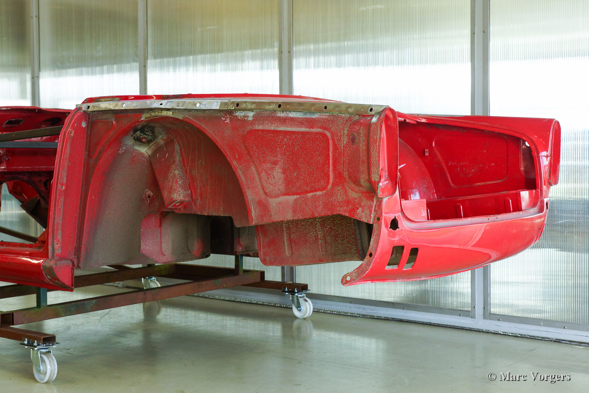 Triumph TR 250 bare metal body restoration. The car was fully stripped, paint removed, blasted and primed with epoxy. Sheet metal work carried out. Currently the body is at the paintshop. The body is sanded down to the bare metal, epoxy primed, primed, smoothened and then finished with a modern multi layer paint system.