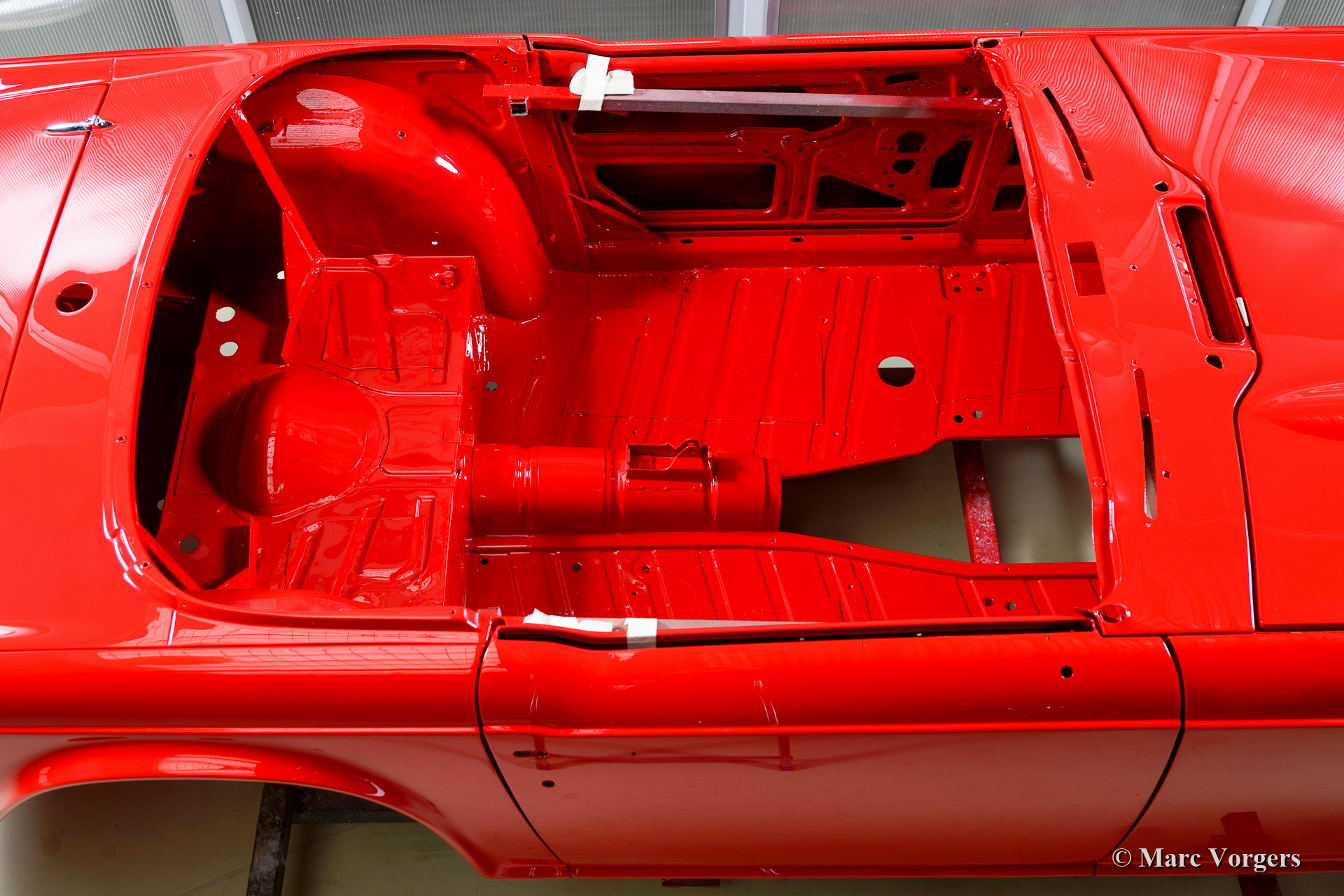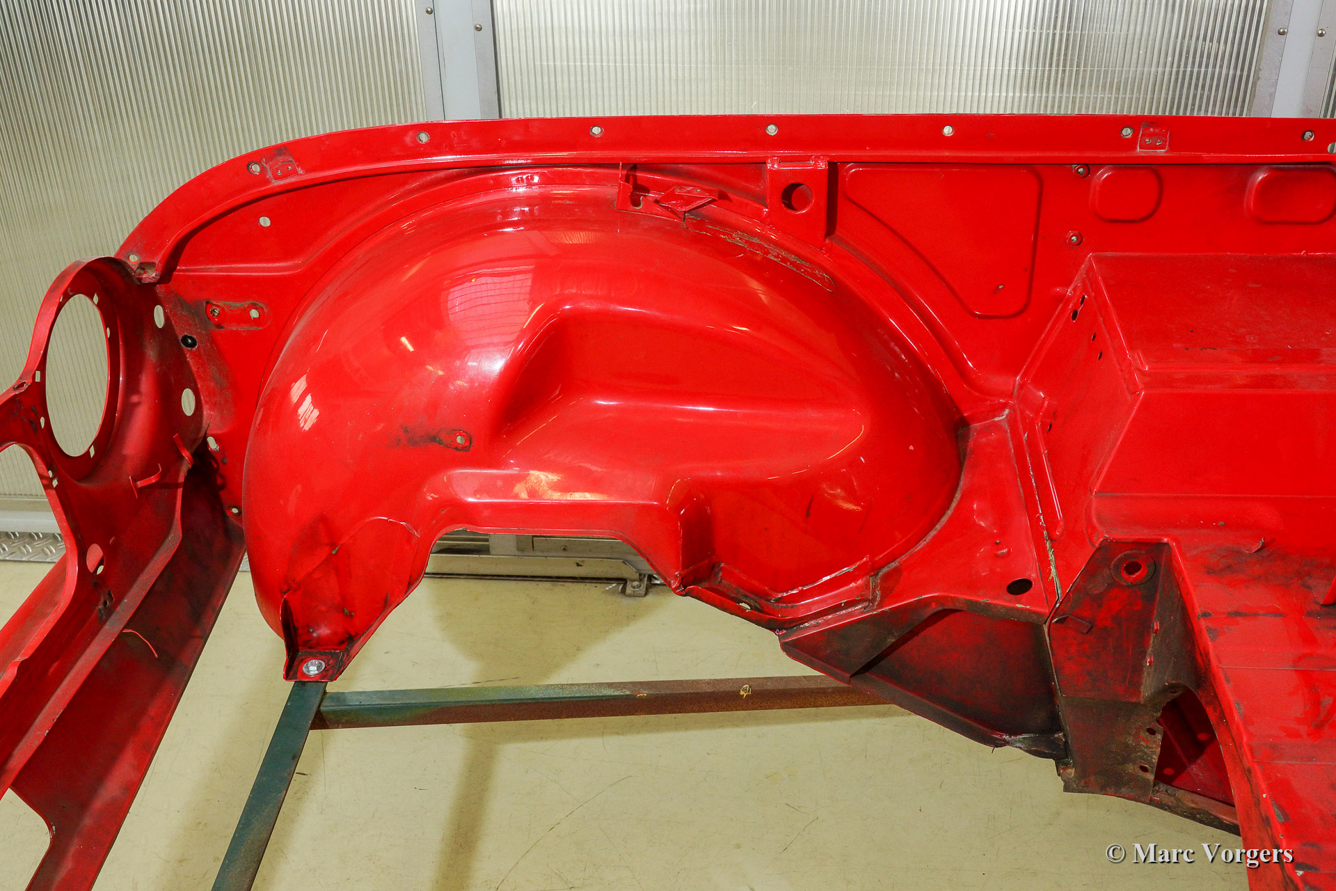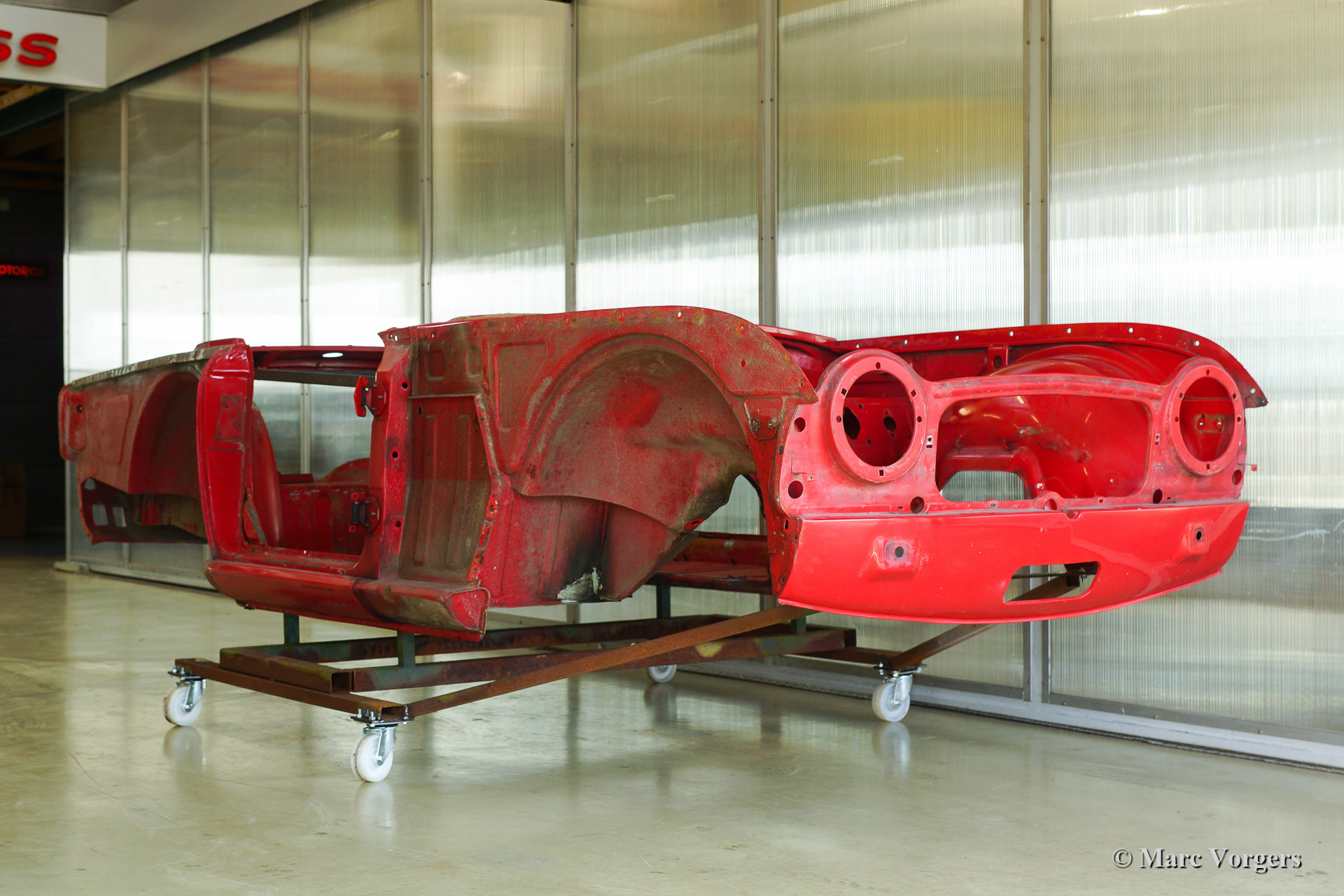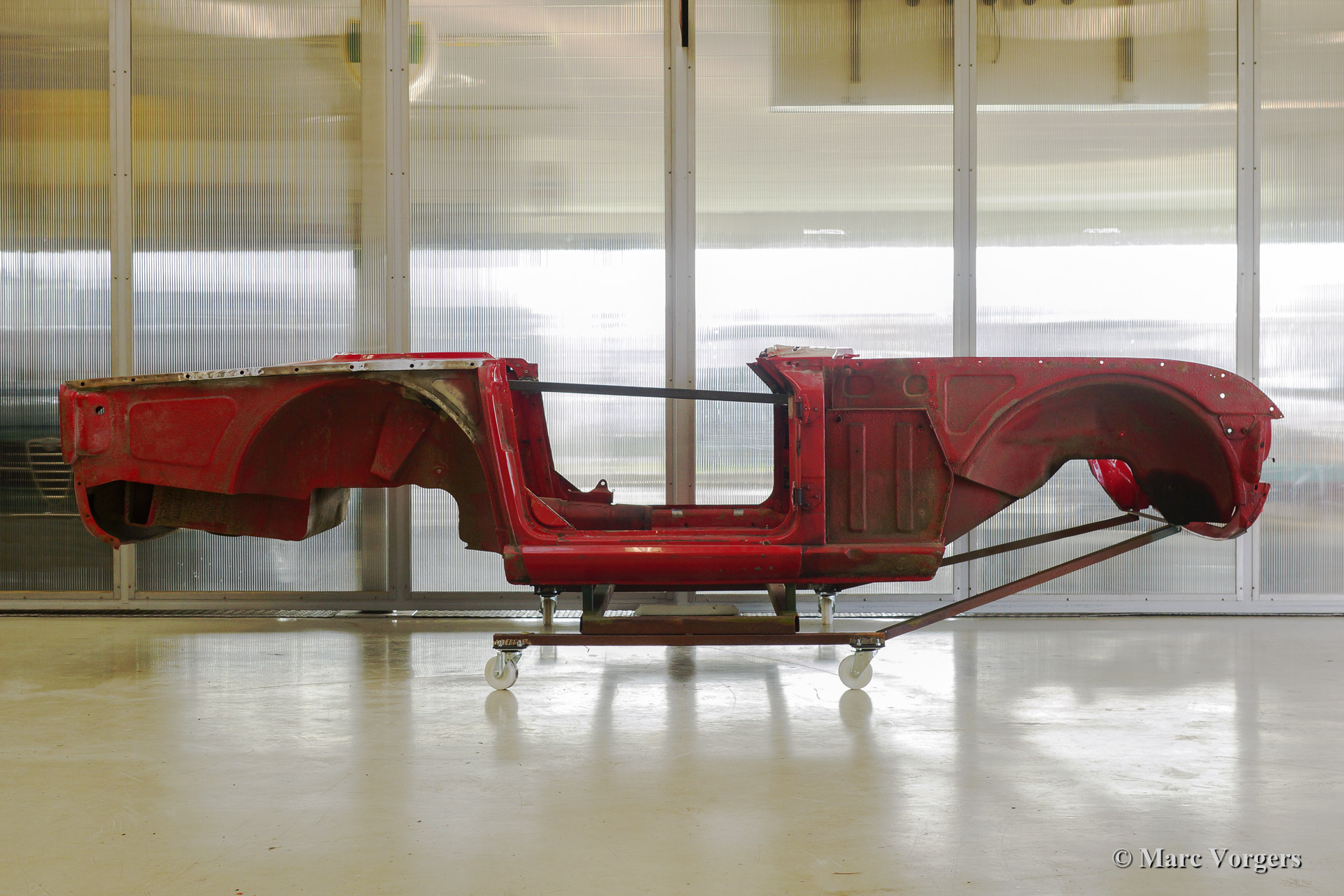 Triumph TR 250 bare metal body restoration. The car was fully stripped, paint removed, blasted and primed with epoxy. Sheet metal work carried out. Currently the body is at the paintshop. The body is sanded down to the bare metal, epoxy primed, primed, smoothened and then finished with a modern multi layer paint system.