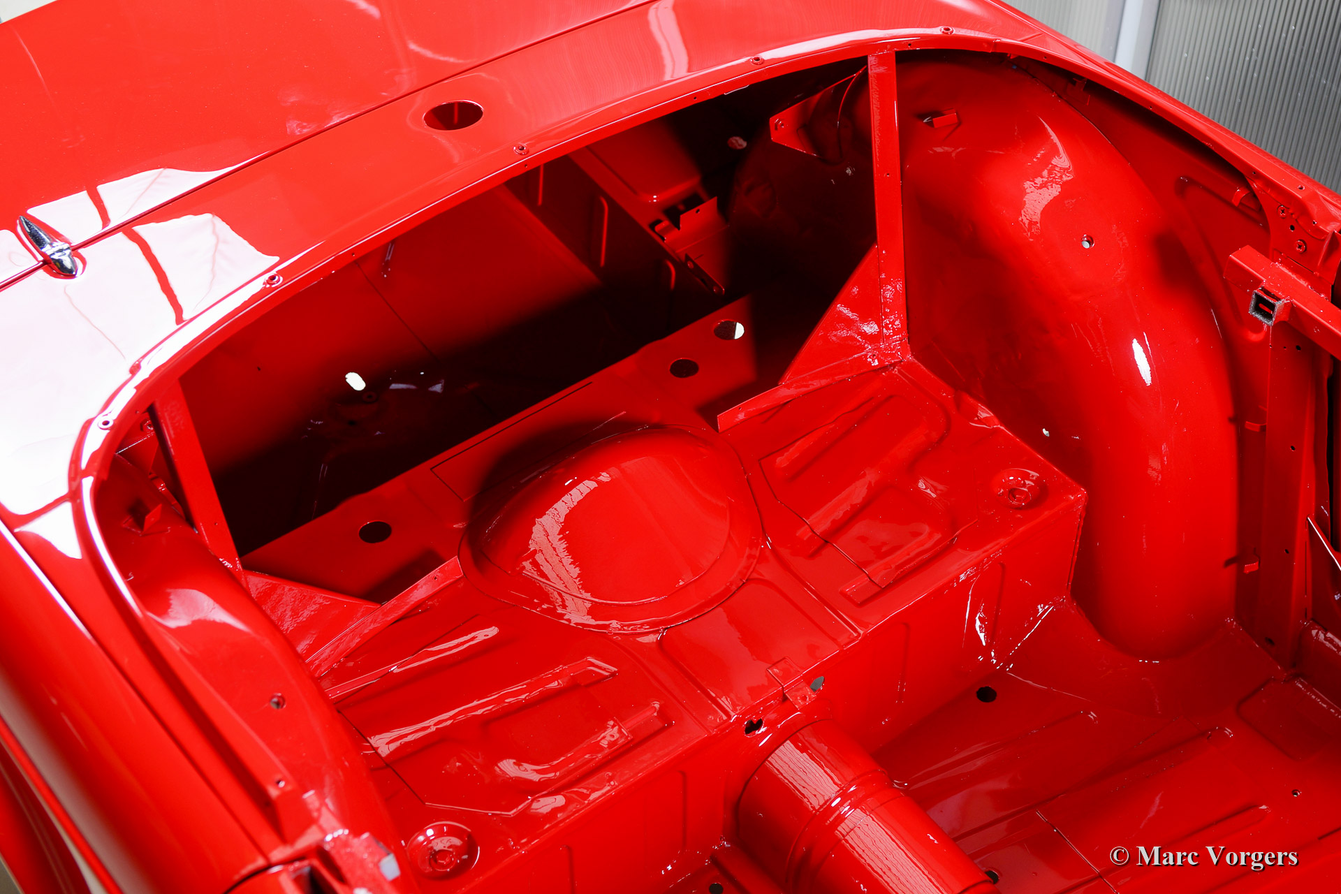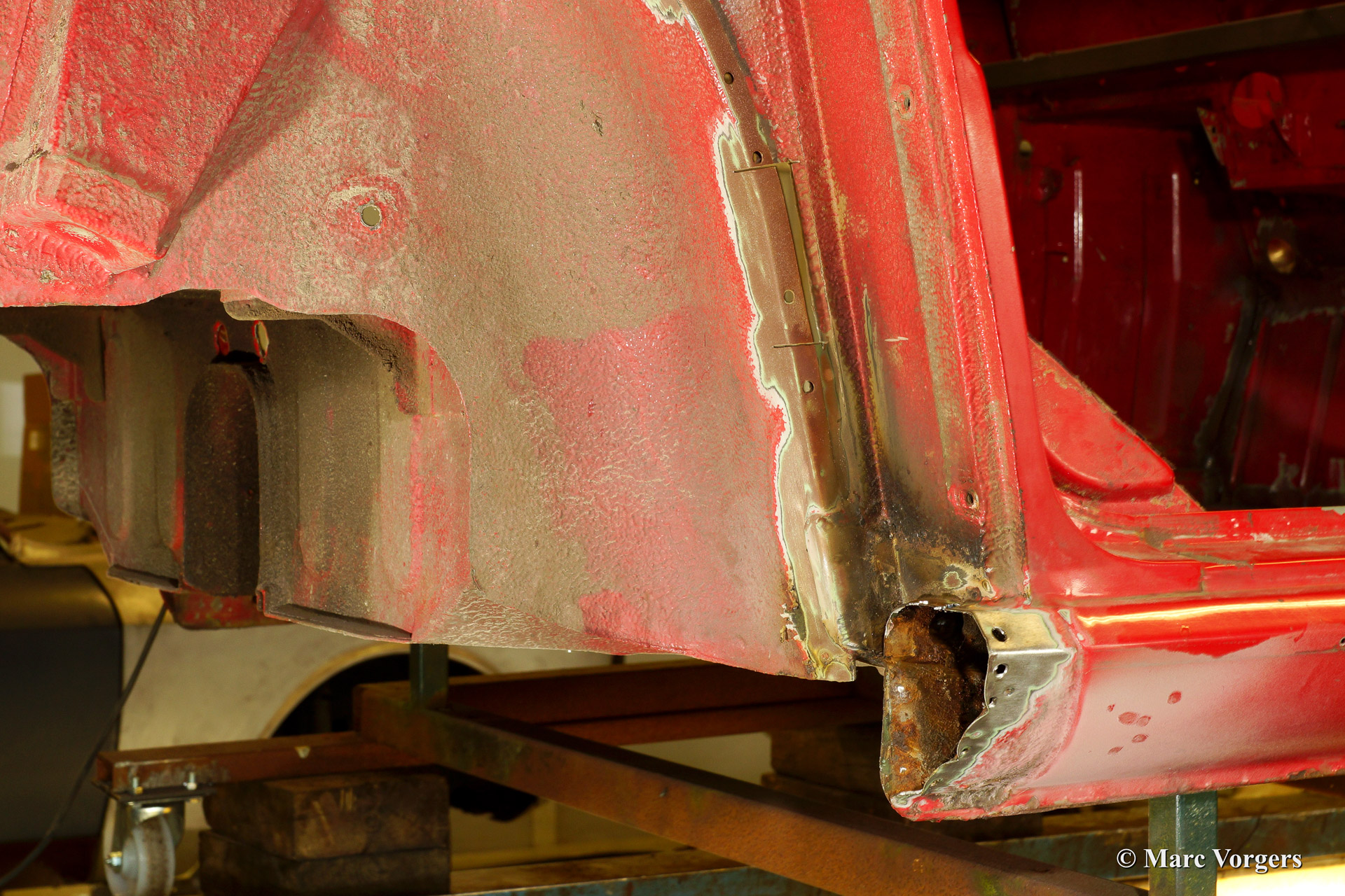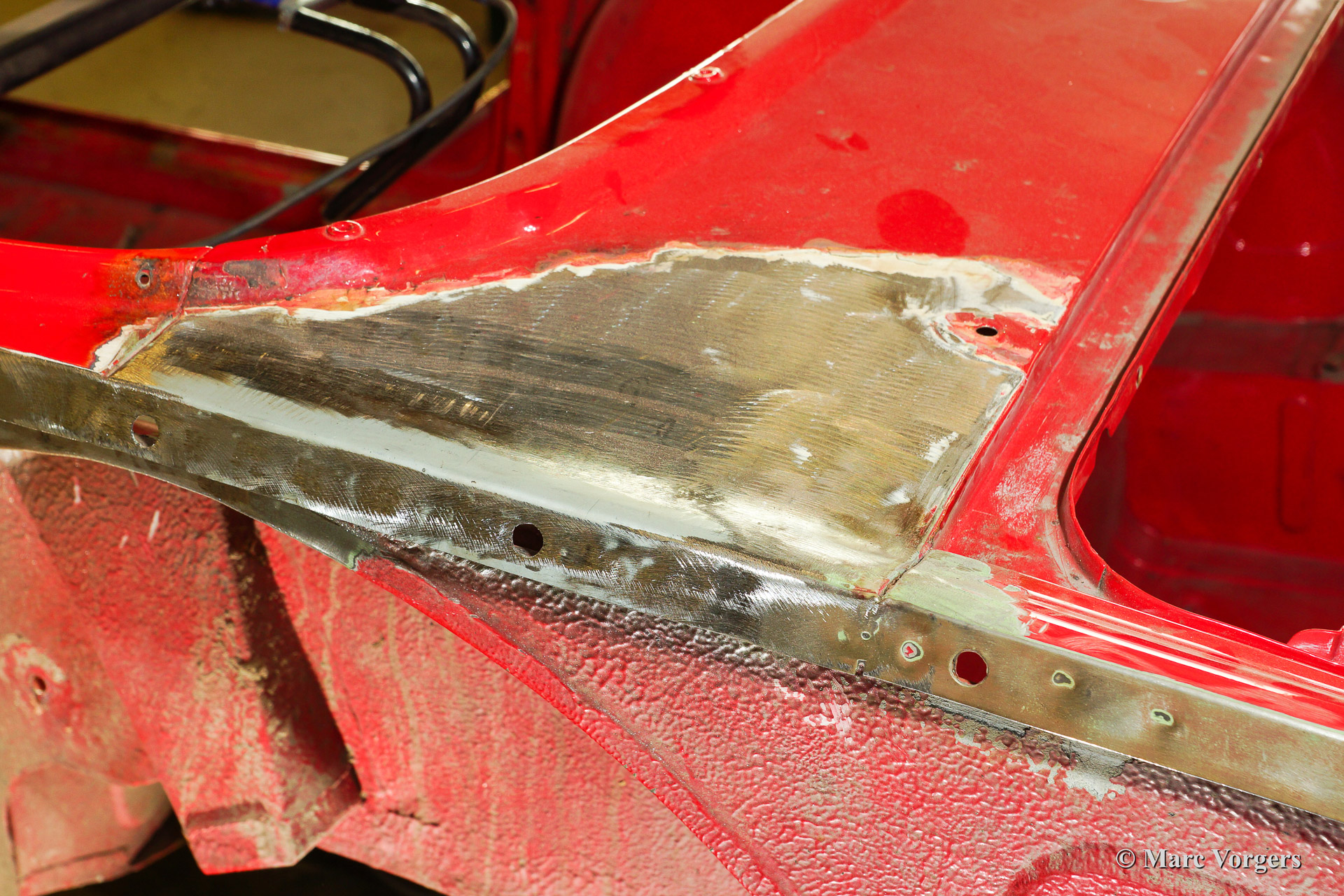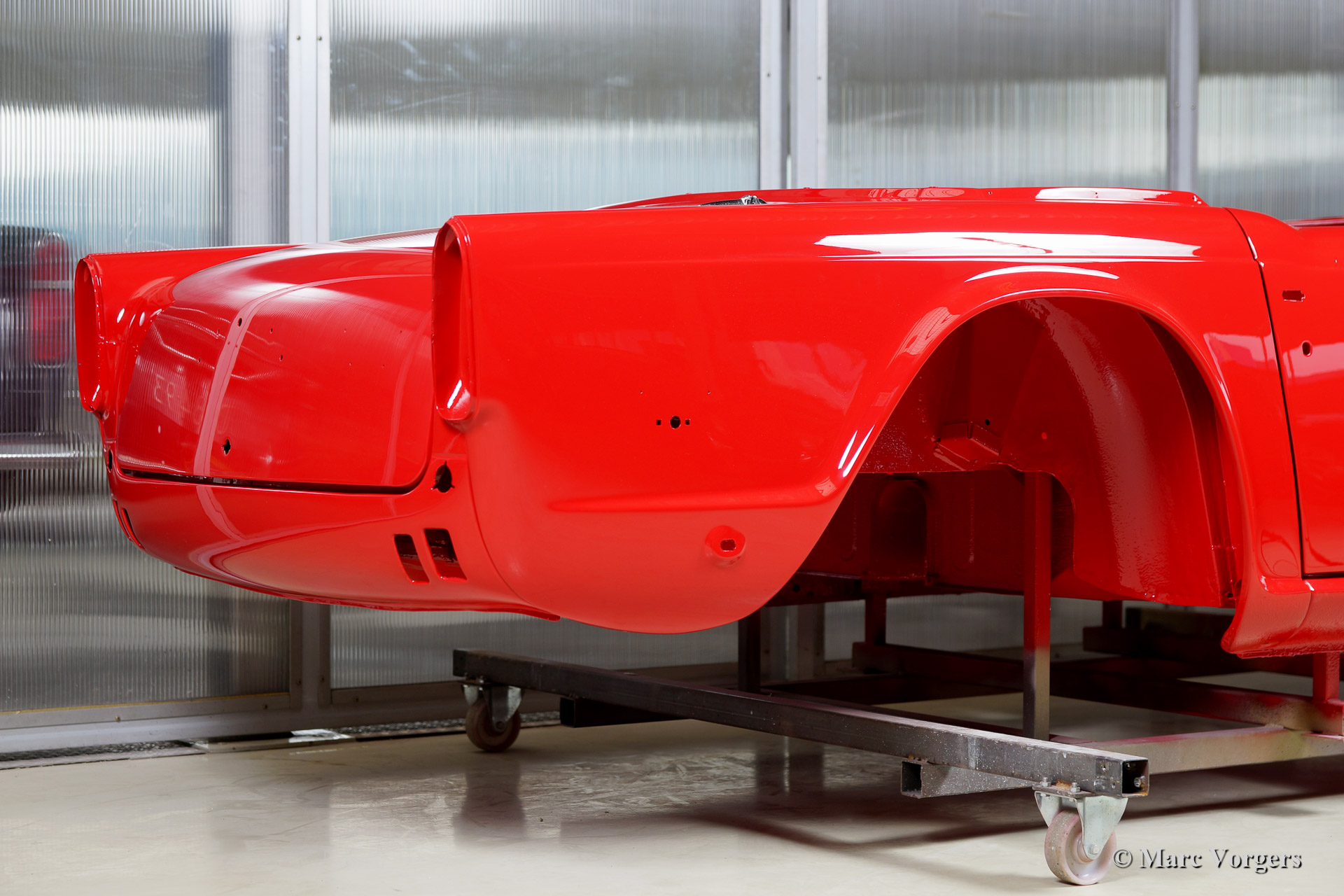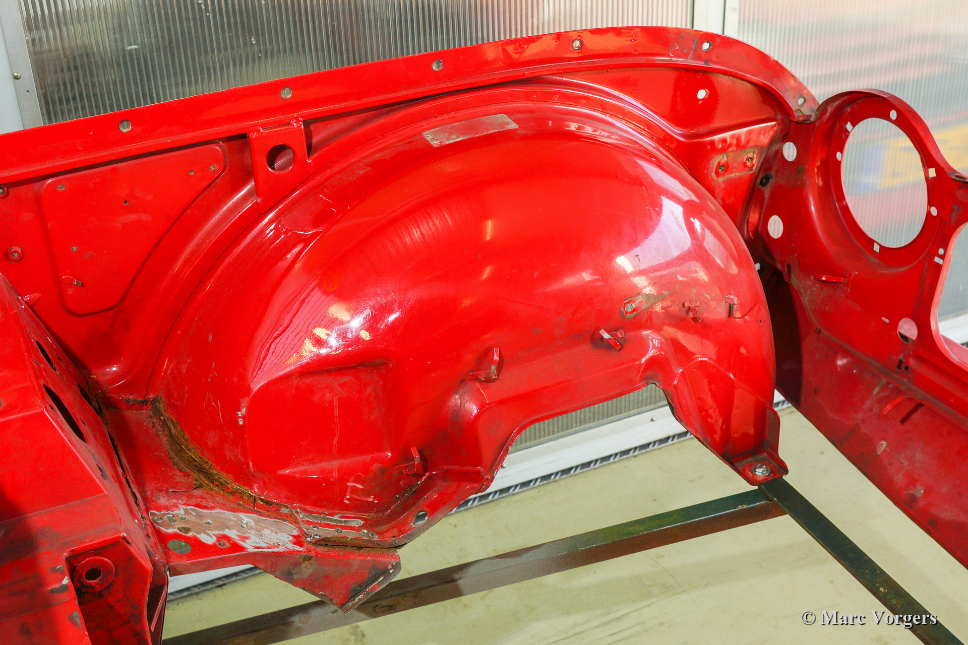 Triumph TR 250 bare metal body restoration. The car was fully stripped, paint removed, blasted and primed with epoxy. Sheet metal work carried out. Currently the body is at the paintshop. The body is sanded down to the bare metal, epoxy primed, primed, smoothened and then finished with a modern multi layer paint system.