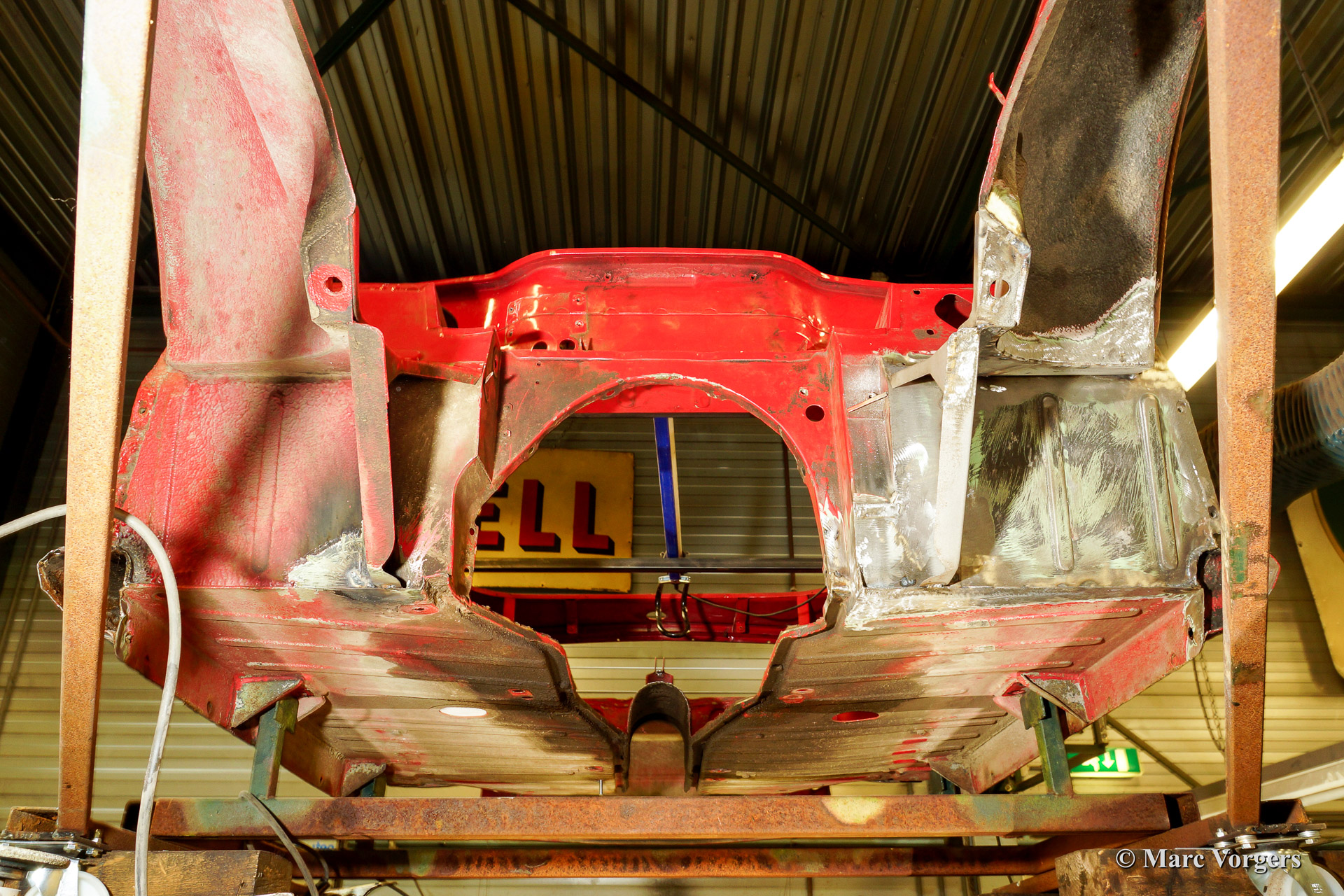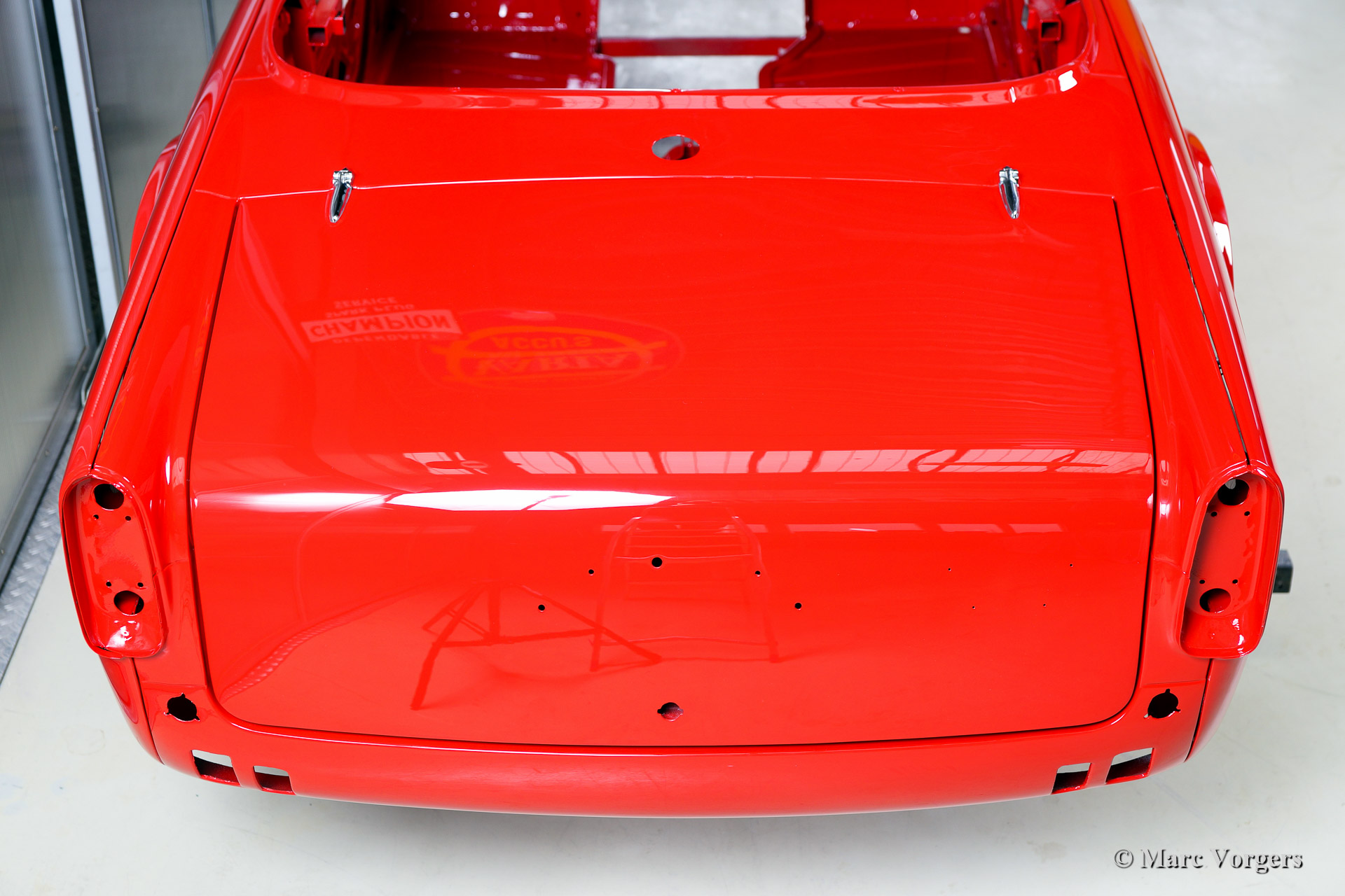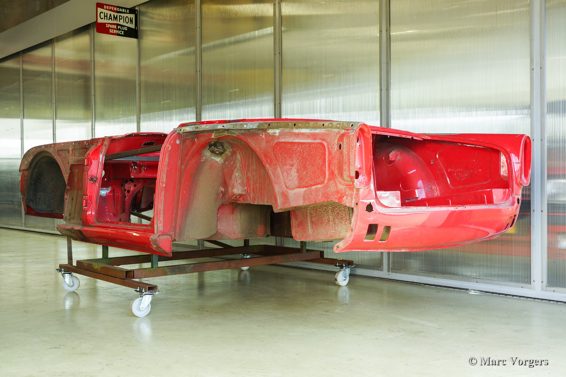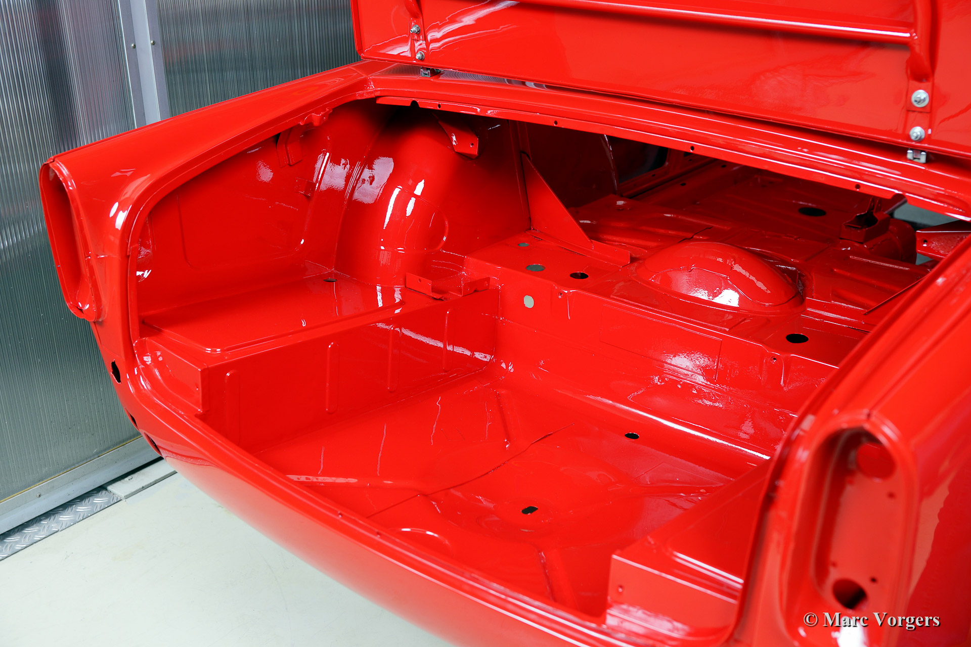 Triumph TR 250 bare metal body restoration. The car was fully stripped, paint removed, blasted and primed with epoxy. Sheet metal work carried out. Currently the body is at the paintshop. The body is sanded down to the bare metal, epoxy primed, primed, smoothened and then finished with a modern multi layer paint system.